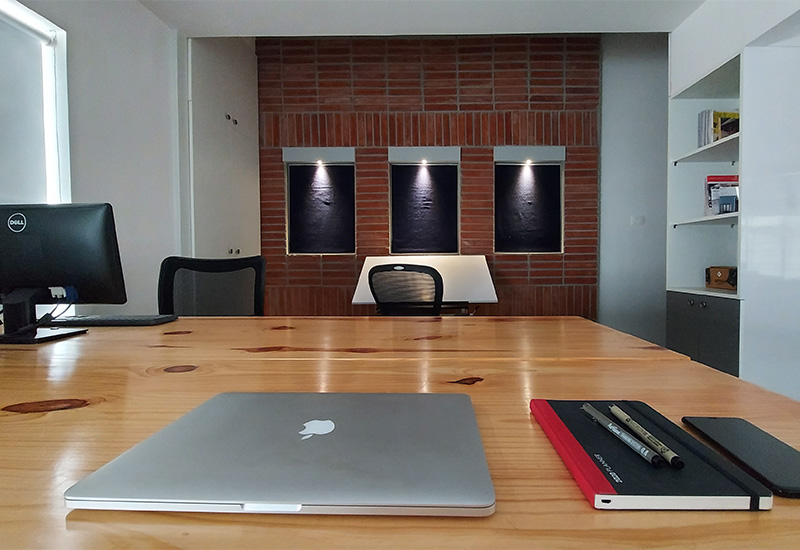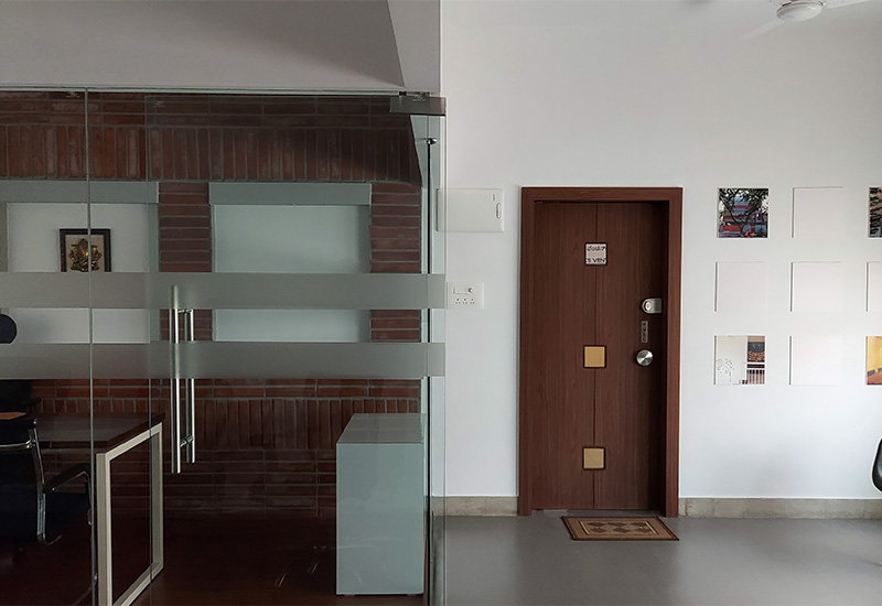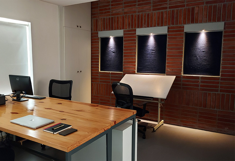 Office space for our main architectural consultant in a 500sft carpet area in the heart of south bangalore. Use of natural materials as wall highlight, no intermediate barriers or walls and use of white color the small space gives a feel of a much larger space. The whole office is conceived as an open office with just a glass partition separating the principal's cabin.